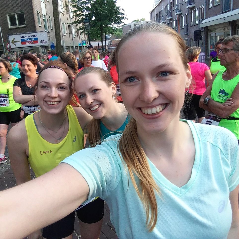 lopers het parcours opgestuurd en ik moet zeggen dat het starten mij alles meeviel! Waar ik in Enschede pas rond kilometer twee eindelijk wat mensen voorbij kon, ging dat in de smalle Alkmaarse straatjes best aardig. Ilona liep voorop en gooide het tempo goed omhoog. Zo leuk om tijdens het rennen door “mijn oude stadje” heen te gaan. We gingen langs de Molen van Piet, het centrum weer verder in en alle leuke straatjes door. Overal stonden mensen langs het parcours en waar dat soms een tikkeltje lastig was met inhalen, was het wel ontzettend tof! Wat een energie zeg. Vlak voor de drankpost leek ik heel even iets te voelen in mijn knie. Samen met Valerie en Ilona even rustig ons bekertje opgedronken om daarna weer het tempo op te pakken. Ik voelde niks meer!