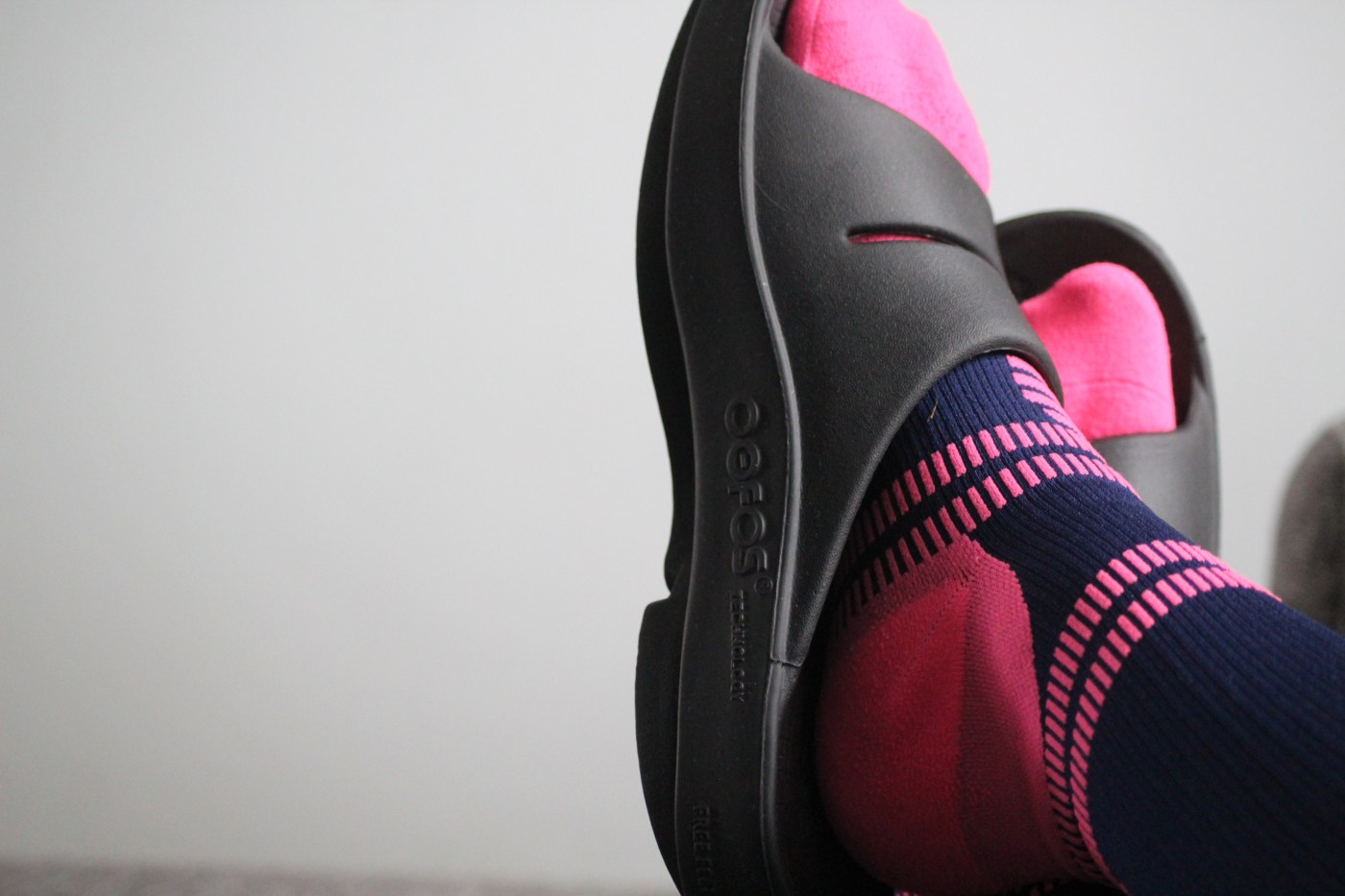 De eerste keer dat ik ze aantrok was na een intensieve interval training op de track. Mijn benen en voeten waren goed moe, dus was het tijd voor de OOfos test. De hardloopschoenen werden ongeveer op de mat bij de voordeur al vervangen voor de vers uitgepakte slippers en gingen niet meer uit! Het eerste gevoel was wel heel gek, vooral zo vlak na die snelle schoenen. Het voelde een beetje alsof ik vertraagd liep, je voelt echt dat de energie wordt opgevangen door de slipper. Je voelt wel direct het comfort van de slipper, ze lopen heel lekker. Daarnaast ben ik nogal een overproneerder en lijken mijn enkels vaak op de toren van Pisa wanneer ik op slippers loop, maar ik zak tijdens het lopen op de OOfos niet naar binnen! +1 voor de OOfos!