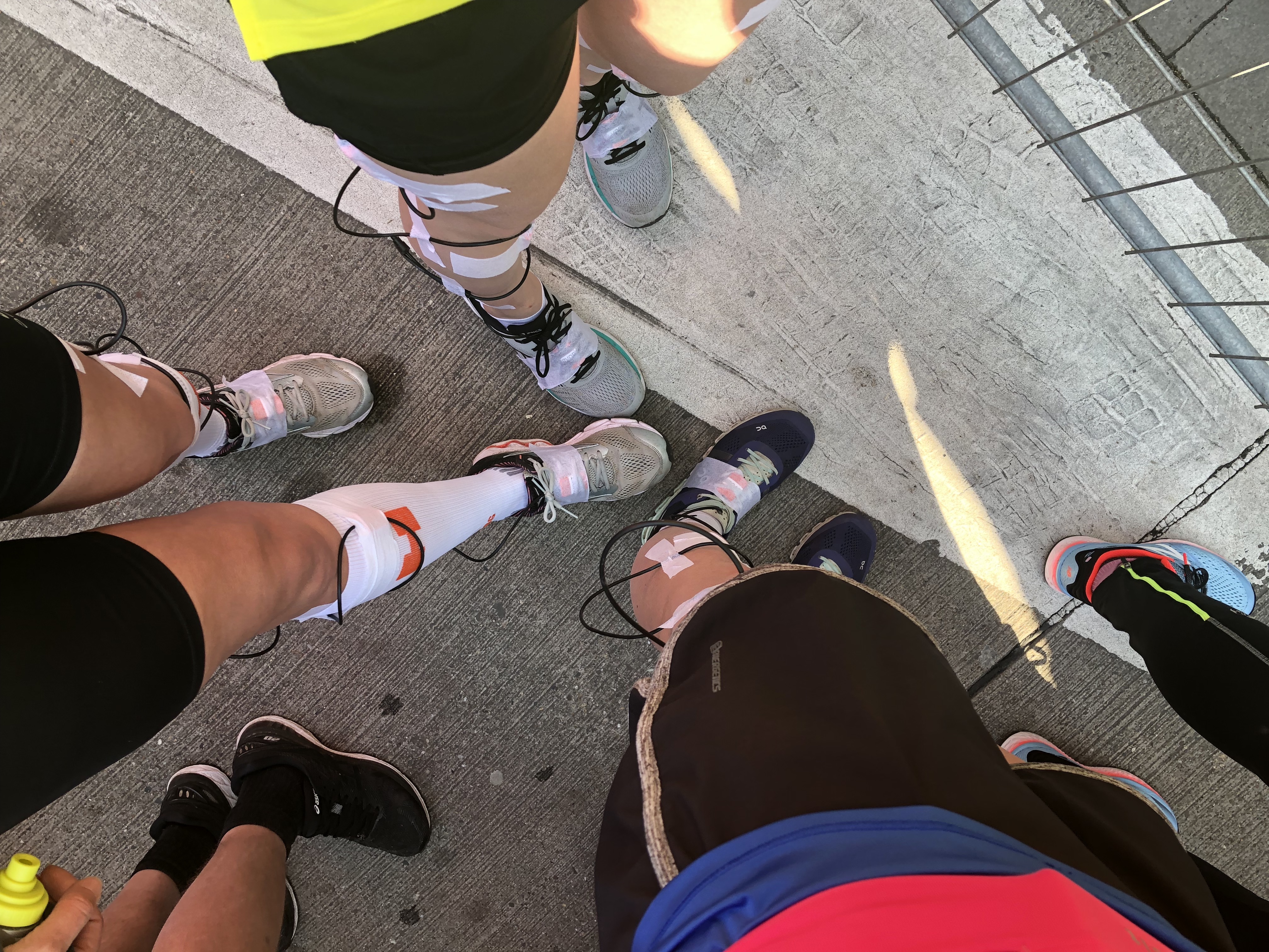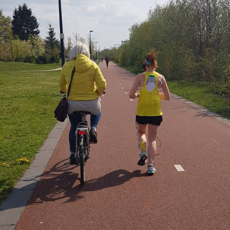 Wanneer een van de lopers van het groepje vraagt wat ik allemaal voor snoertjes om me heen heb bedenk ik me pas weer dat ik inderdaad met de sensoren loop. Het enige wat ik er tot nu toe aan gemerkt heb is dat de tape op mijn schoenen een beetje los begint te laten, gelukkig staat op km 21 het team van RRD voor een checkup! Michael fietst nog een klein stukje mee en ik geef hem nog mijn armsleeves mee. Inmiddels is het namelijk dusdanig warm geworden dat ik die niet meer nodig heb.
