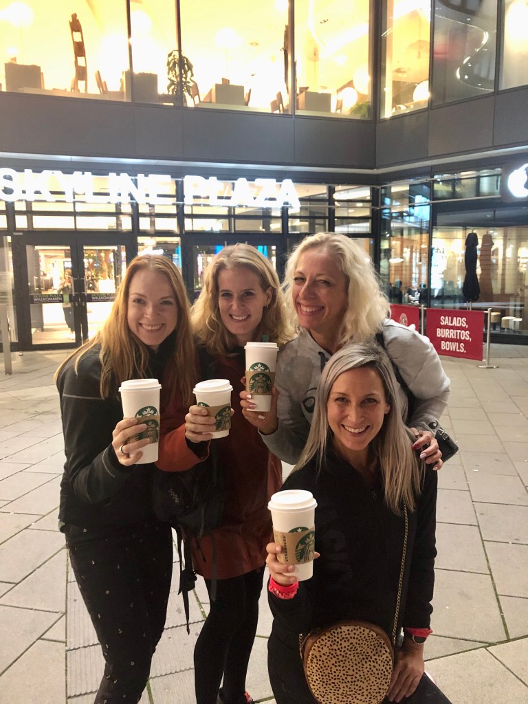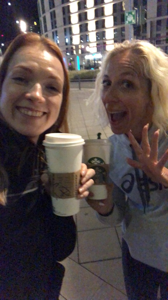 Natalie had een hotel geboekt wat vlakbij de start/finish zat; en ook nog eens dicht bij een starbucks <3. We ontmoeten elkaar in het hotel en na even kort bijkletsen gingen we samen uit eten met een hele groep ASICS Frontrunners en winnares van de Intersport actie; Eveline en haar man! Het was een enorm gezellige avond en heb zelfs nog een beetje mijn Duits kunnen oppoetsen met een van de Duitse leden van het team. Na nog even na te genieten van het uitzicht over de skyline, haalden de dames nog een chai latte bij Starbucks en besloten we naar het hotel te gaan!