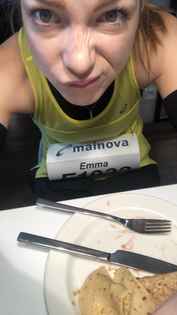 Natalie en ik begonnen RUIM op tijd aan ons ontbijt. Op de een of andere manier blijft dit bij mij een soort gevecht. Ik kan werkelijk waar de hele dag door eten, maar probeer iets in mijn systeem te krijgen tussen de uren 7-10 ’s ochtends en er ontstaat een ware strijd.. Afijn, in ruim twee uur wist ik mijn standaard ontbijtje erin te krijgen. Natalie, die de Staffel (estafette) liep, moest iets eerder de kamer uit en na een dikke knuffel zat ik daar in mijn eentje. Nog even het ergste van de pre-race jitters eruit gedanst op wat foute Duitse hitjes en daarna richting de start waar ook Ilona en Valerie al klaarstonden. Onze starttijd kwam langzaamaan dichtbij!
