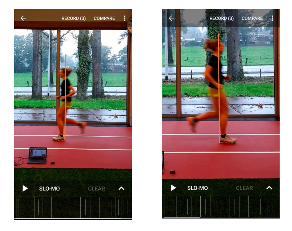 Vanaf de zijkant gefilmd valt het op dat ik iets voor mijn zwaartepunt landt, ook wel overstriding genoemd. Dit is eigenlijk een soort remmende beweging, iets wat voor een goede loopeconomie eigenlijk niet in dit plaatje past. Er komen hierdoor namelijk grote krachten vrij die weer opgevangen moeten worden door de rest van je lichaam, met als resultaat; vermoeidheid. Verder valt op dat bij het landen mijn rechterbeen meer in strekking is dan mijn linker. Door het niet goed meebuigen komt er teveel impact op dat been, dit zou meer moeten zijn zoals in het plaatje van het linkerbeen.