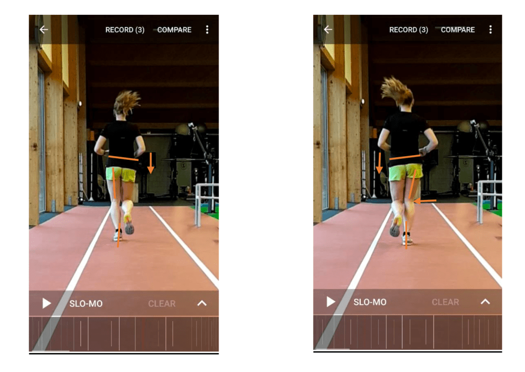 Een andere bevinding is een ‘pelvic drop’ (doorzakken van de heup) rechts. Dit is heel goed te zien in onderstaande afbeelding.